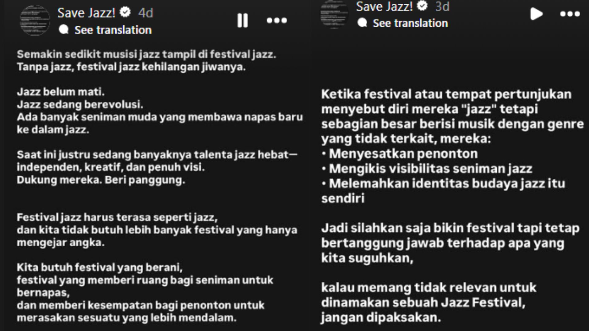 “Semakin sedikit musisi jazz tampil di festival jazz. Tanpa jazz, festival jazz kehilangan jiwanya.” Tulis Indra Lesmana.