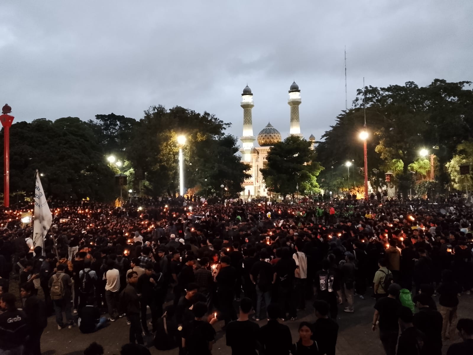 Hingga malam hari, massa masih bertahan dengan rangkaian doa bersama. Aksi damai itu menjadi simbol bahwa duka bisa dirawat bersama, sekaligus menyuarakan harapan agar keadilan benar-benar ditegakkan.