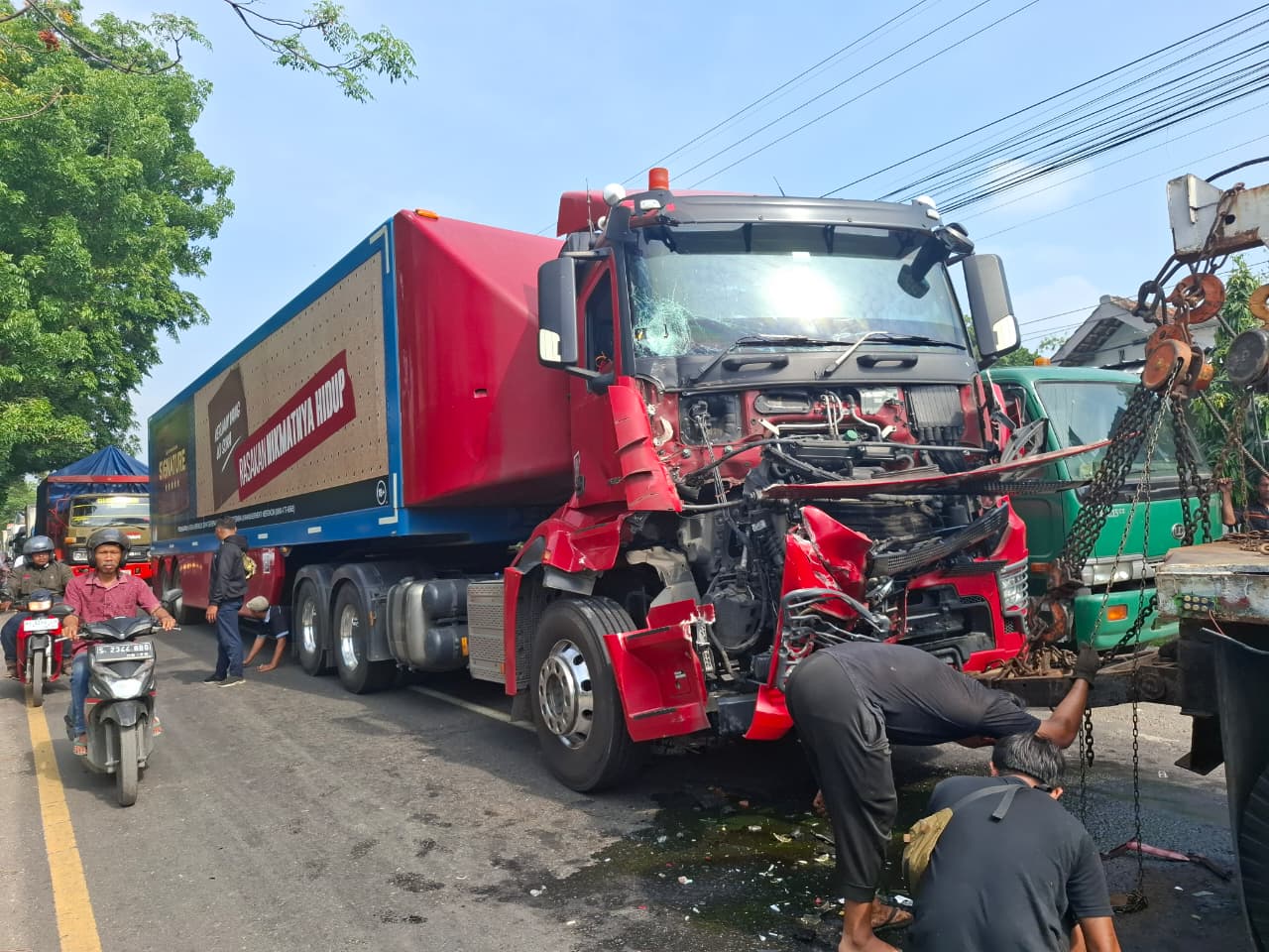 Benturan membuat bagian depan truk trailer rokok ringsek parah dan berhenti melintang di tengah jalan. Kondisi itu memicu antrean panjang kendaraan di jalur arteri nasional, terutama dari rombongan truk yang mengular hingga ratusan meter.